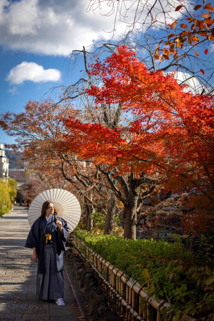 Studio-only or a quick shoot in front of the shop — your choice. BUT, right in front of our studio is the super photogenic Gion Shirakawa area. It changes its look with every season, and it’s beautiful all year round. A quick storefront photoshoot here is always a must‑try.